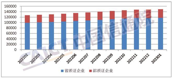 近日,中國信通院發(fā)布《國內(nèi)增值電信業(yè)務(wù)許可情況報告(2023.1)》。報告顯示,截至2023年1月底,全國增值電信業(yè)務(wù)經(jīng)營許可企業(yè)共143076家(其中5742家企業(yè)同時持有工業(yè)和信息化部及省通信管理局頒發(fā)的增值電信業(yè)務(wù)經(jīng)營許可),比上月增長0.84%,其中工業(yè)和信息化部許可的跨地區(qū)企業(yè)31017家,各?。▍^(qū)、市)通信管理局許可的本地企業(yè)合計117801家,分別比上月增長0.52%和0.90%。