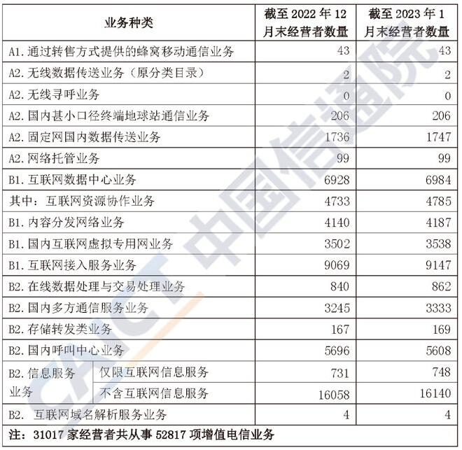 表1 截至2023年1月末跨地區(qū)各類增值電信業(yè)務(wù)經(jīng)營者數(shù)量