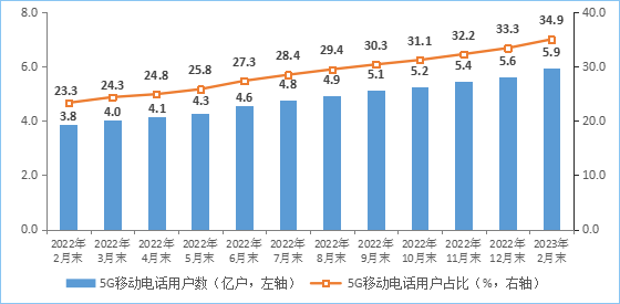 移動電話用戶數(shù)穩(wěn)中有增,5G用戶占比不斷提升。截至2月末,三家基礎(chǔ)電信企業(yè)的移動電話用戶總數(shù)達16.95億戶,比上年末凈增1188萬戶。其中,5G移動電話用戶達5.92億戶,比上年末凈增3129萬戶,占移動電話用戶的34.9%,占比較上年末提升1.6個百分點。