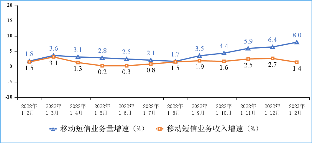 移動電話通話量低速增長,移動短信業(yè)務(wù)量增速持續(xù)回升。1—2月份,移動電話去話通話時長完成3583億分鐘,同比增長3.1%;固定電話主叫通話時長完成114.4億分鐘,同比下降5.2%。1—2月份,全國移動短信業(yè)務(wù)量同比增長8%;移動短信業(yè)務(wù)收入同比增長1.4%,增速較上年末分別提升1.6個和回落1.3個百分點。