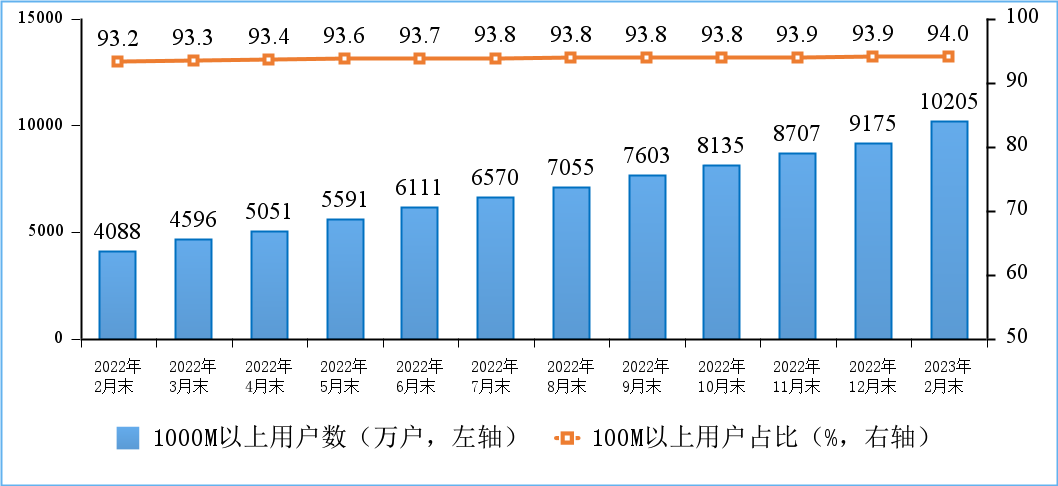 固定寬帶接入用戶穩(wěn)步增加,千兆用戶突破億級規(guī)模。截至2月末,三家基礎(chǔ)電信企業(yè)的固定互聯(lián)網(wǎng)寬帶接入用戶總數(shù)達5.99億戶,比上年末凈增902.2萬戶。其中,100Mbps及以上接入速率的固定互聯(lián)網(wǎng)寬帶接入用戶達5.63億戶,占總用戶數(shù)的94%,占比較上年末提升0.1個百分點;1000Mbps及以上接入速率的固定互聯(lián)網(wǎng)寬帶接入用戶達1.02億戶,比上年末凈增1031萬戶,占總用戶數(shù)的17%,占比較上年末提升1.4個百分點。