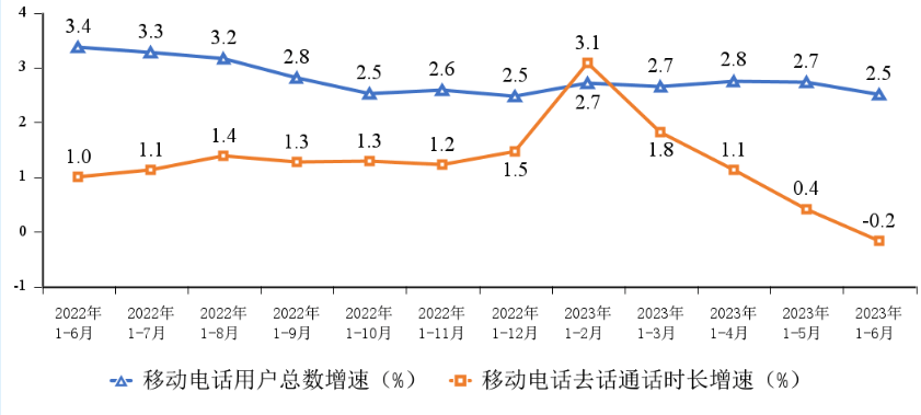 移動電話通話量小幅回落,移動短信業(yè)務(wù)收入增速轉(zhuǎn)負。上半年,移動電話去話通話時長完成 1.12 萬億分鐘,同比下降 0.2%;固定電話主叫通話時長完成 393.2 億分鐘,同比下降 4.1%。上半年,全國移動短信業(yè)務(wù)量同比增長 5.3%,移動短信業(yè)務(wù)收入同比下降 0.2%,增速較一季度分別提升 0.1 個和回落 1.6 個百分點。