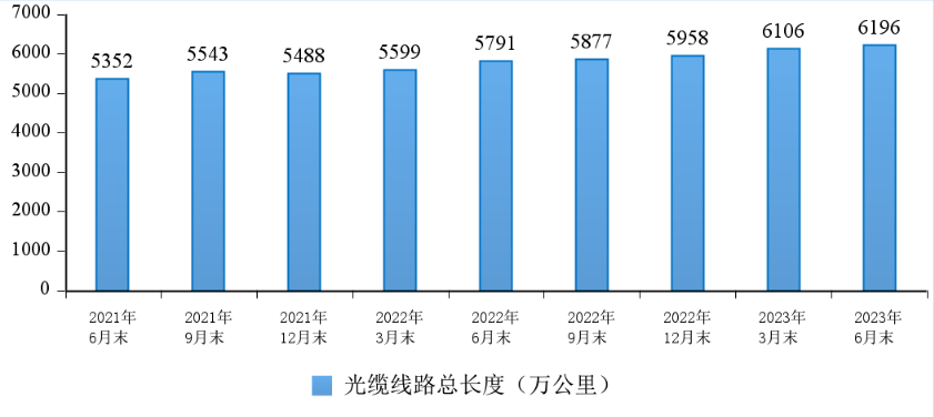 光纜線路總長度穩(wěn)步增加。截至 6 月末,全國光纜線路總長度達到 6196 萬公里,比上年末凈增 238.1 萬公里。其中接入網(wǎng)光纜、本地網(wǎng)中繼光纜和長途光纜線路所占比重分別為 62.6%、35.7% 和 1.8%,本地網(wǎng)中繼光纜比重同比提高 0.2 個百分點。