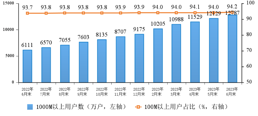 固定寬帶接入用戶數(shù)穩(wěn)步增加,千兆用戶占比超兩成。截至 6 月末,三家基礎(chǔ)電信企業(yè)的固定互聯(lián)網(wǎng)寬帶接入用戶總數(shù)達 6.14 億戶,比上年末凈增 2468 萬戶。其中,100Mbps 及以上接入速率的固定互聯(lián)網(wǎng)寬帶接入用戶達 5.79 億戶,占總用戶數(shù)的 94.2%,占比較上年末提升 0.3 個百分點;1000Mbps 及以上接入速率的固定互聯(lián)網(wǎng)寬帶接入用戶達 1.28 億戶,比上年末凈增 3612 萬戶,占總用戶數(shù)的 20.8%。