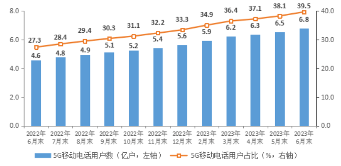 截至 6 月末,三家基礎(chǔ)電信企業(yè)的移動電話用戶總數(shù)達 17.1 億戶,其中 5G 移動電話用戶達 6.76 億戶,占移動電話用戶的 39.5%。
