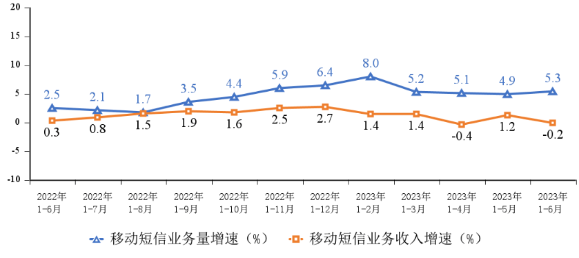 移動短信業(yè)務(wù)量和收入同比增長情況