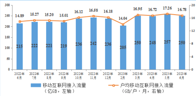 移動互聯(lián)網(wǎng)流量增速持續(xù)提升,6 月 DOU 值保持較高水平。上半年,移動互聯(lián)網(wǎng)累計流量達 1423 億 GB,同比增長 14.6%,增速較一季度回升 0.9 個百分點。截至 6 月末,移動互聯(lián)網(wǎng)用戶數(shù)達 14.9 億戶,比上年末凈增 3825 萬戶。6 月當月戶均移動互聯(lián)網(wǎng)接入流量(DOU)達到 16.78GB / 戶?月,同比增長 12.8%,較上年 12 月份高 0.6GB / 戶?月。