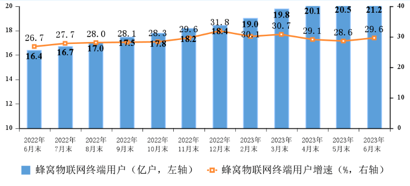 蜂窩物聯(lián)網(wǎng)用戶較快增長,IPTV 用戶穩(wěn)步增加。截至 6 月末,三家基礎(chǔ)電信企業(yè)發(fā)展蜂窩物聯(lián)網(wǎng)終端用戶 21.2 億戶,比上年末凈增 2.79 億戶,占移動網(wǎng)終端連接數(shù)(包括移動電話用戶和蜂窩物聯(lián)網(wǎng)終端用戶)的比重達 55.4%。IPTV(網(wǎng)絡(luò)電視)總用戶數(shù)達 3.92 億戶,比上年末凈增 1148 萬戶。