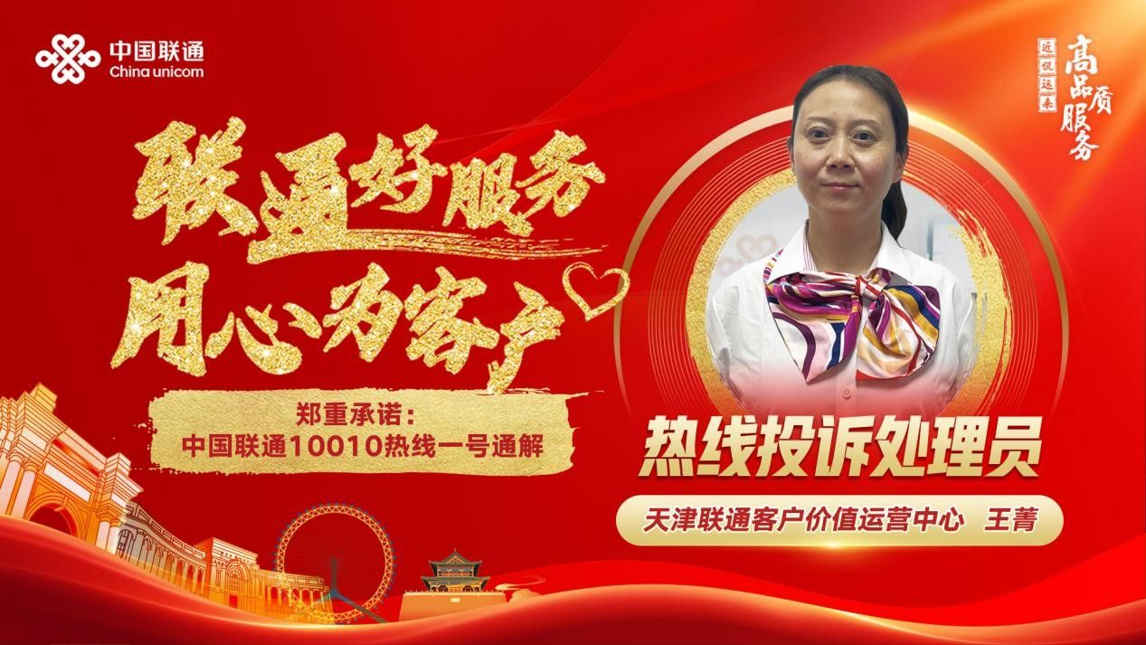 王菁是一名天津聯(lián)通客戶價(jià)值運(yùn)營(yíng)中心熱線投訴處理員,她代表全體處理人員承諾:有呼必應(yīng),有問必答;解釋差錯(cuò)零容忍,高星客戶1v1服務(wù),專業(yè)問題專家處理,負(fù)面清單零發(fā)生。