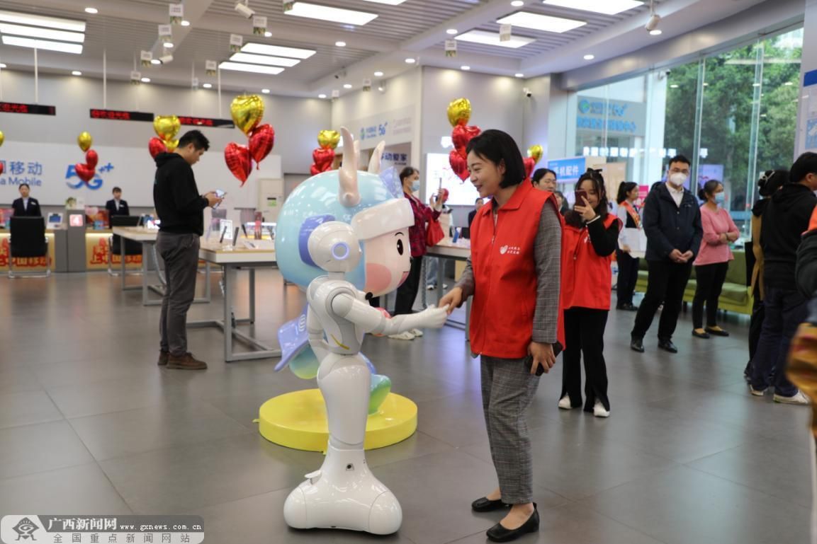 廣西移動玉林城東廳旗艦店與客戶互動的機器人。