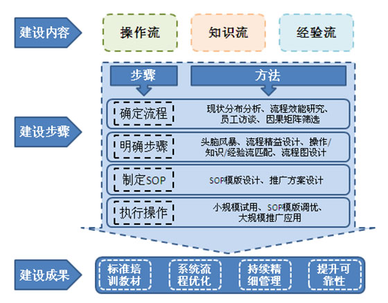 SOP標準作業(yè)程序一是實現(xiàn)了操作流程、知識流程、服務(wù)經(jīng)驗流程的復(fù)合管理;二是在推進步驟過程中實現(xiàn)了SOP、六西格碼、精益等優(yōu)秀方法的復(fù)合應(yīng)用;三是實現(xiàn)了各種流程執(zhí)行和管理要素的復(fù)合展示;四是實現(xiàn)了流程步驟、知識內(nèi)容等規(guī)則類信息和操作時長等量化指標的復(fù)合管理。