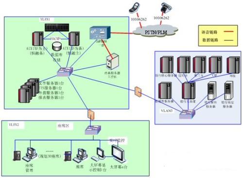 設(shè)計方案采用華為TopEng呼叫中心產(chǎn)品純IP方式組網(wǎng),按照網(wǎng)絡(luò)區(qū)域可分為三個部分:核心系統(tǒng)區(qū)VLAN1,座席服務(wù)區(qū)VLAN2和銀行核心或前置服務(wù)器VLAN3。