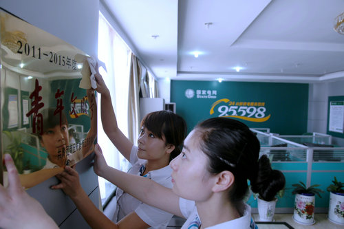 圖為:6 月15日清晨,虞城供電公司95598兩名座席人員在班前對榮譽匾牌進行細心的呵護。
