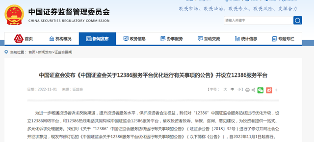 11月1日,證監(jiān)會對“12386”中國證監(jiān)會服務(wù)熱線進行優(yōu)化升級,設(shè)立12386網(wǎng)絡(luò)平臺,和12386熱線電話共同構(gòu)成中國證監(jiān)會12386服務(wù)平臺,接收投資者投訴、舉報、咨詢、意見建議,為投資者提供一站式、多元化訴求處理服務(wù)。