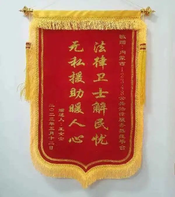 近日,內(nèi)蒙古“12348”公共法律服務(wù)熱線平臺收到呼和浩特市市民王女士贈送的“法律衛(wèi)士解民憂 無私援助暖人心”錦旗。
