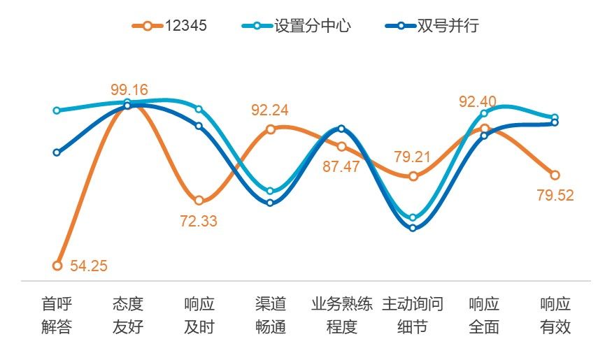 本年度將6條雙號(hào)并行熱線和設(shè)置分中心的行業(yè)熱線納入監(jiān)測(cè)。監(jiān)測(cè)結(jié)果顯示,12345熱線在接通情況和接待禮儀方面表現(xiàn)更好,在問(wèn)題解決方面與雙號(hào)并行、設(shè)置分中心熱線存在差距。