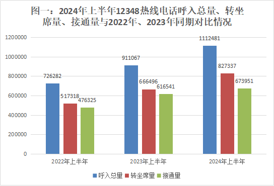 2024年上半年,12348熱線平臺(tái)的電話呼入總量、轉(zhuǎn)坐席量較前兩年同期均有較明顯提高,群眾需求呈現(xiàn)顯著增長(zhǎng)趨勢(shì)。與2023年同期相比,電話呼入總量增長(zhǎng)22.11%,轉(zhuǎn)坐席量增長(zhǎng)24.13%,群眾咨詢需求持續(xù)增長(zhǎng);在保持坐席總數(shù)基本持平的情況下,電話接通量673951人次,較2023年同期增長(zhǎng)9.31%,電話服務(wù)總時(shí)長(zhǎng)81369.68小時(shí),較2023年同期增長(zhǎng)14.34%。