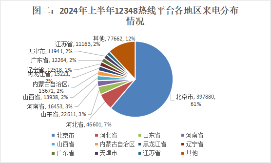 2024年上半年,12348熱線平臺(tái)記錄服務(wù)對(duì)象來(lái)自北京市的工單有397880件,占總工單量的61.22%,同比增長(zhǎng)3.11%;來(lái)源北京市以外地區(qū)的工單共252044件,較去年同期增長(zhǎng)24.34%;來(lái)自京津冀三地的工單數(shù)量較去年同期增長(zhǎng)5.34%。京外號(hào)碼的電話增速顯著高于京內(nèi),北京12348熱線平臺(tái)輻射效應(yīng)更加凸顯。