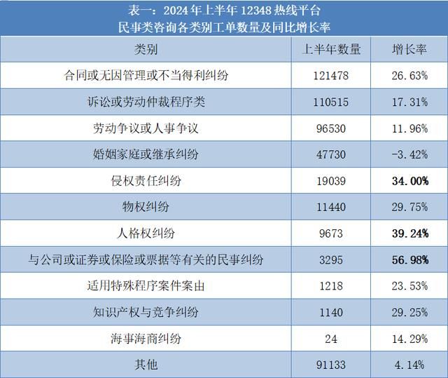 上半年,12348熱線平臺(tái)來(lái)電轉(zhuǎn)人工量較去年同期增長(zhǎng)24.13%,在四個(gè)類別中,“合同糾紛類”咨詢轉(zhuǎn)人工量漲幅最大,較去年同期增長(zhǎng)29.13%。