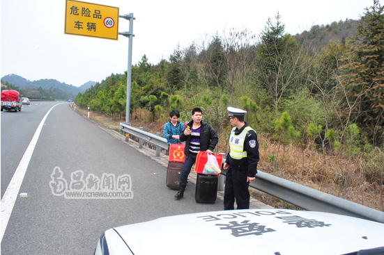進(jìn)入春節(jié)倒計(jì)時(shí),春運(yùn)迎來(lái)客流高峰,“海陸空”立體式返鄉(xiāng)大軍紛紛上路。2月4日,兩名在蘇州打工的江西婺源籍青年王某和董某在趕回家過(guò)年的路上,卻被一無(wú)良客車(chē)司機(jī)拋在離家20公里外的服務(wù)區(qū)內(nèi),兩人無(wú)奈之下背起行李沿高速公路徒步趕路,幸遇在附近巡邏的高速交警熱心幫助,才得以安全順利返鄉(xiāng)。