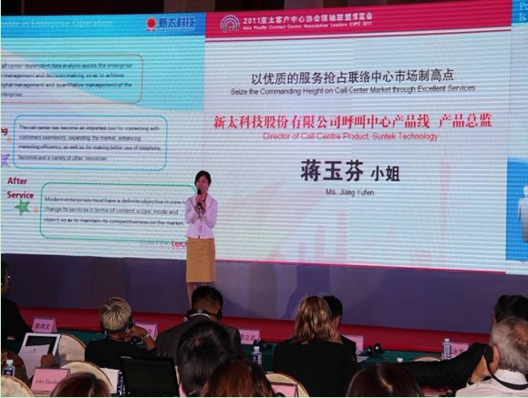 現(xiàn)場可以看到,在本次會議大廳的門前,新太科技的特裝展位非常顯眼。在下午進行的亞太客戶中心協(xié)會高層論壇上,新太科技聯(lián)絡中心產(chǎn)品線產(chǎn)品總監(jiān)蔣玉芬出席了本次論壇,并對于新太科技在聯(lián)絡中心市場的未來發(fā)展提出了“三個堅持、以不變應萬變”的發(fā)展策略。