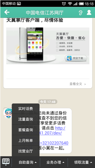 該公眾賬號最大的亮點就在于,除了小i機器人本身外,它是第一個提供智能化服務的易信公眾賬號,依靠小i智能人機交互引擎,該賬號以提供24小時不間斷、一對多的在線服務。當用戶將手機號碼和與此賬號綁定后,用戶可以通過它實現(xiàn)當月話費、套餐余量、上網(wǎng)流量、可用余額、套餐產(chǎn)品、營業(yè)網(wǎng)點等內(nèi)容的查詢服務,也可以辦理話費充值等業(yè)務。同時,因為剛剛上線,為鼓勵用戶試用,該賬號加入了點擊送流量的營銷活動,只要是江蘇天翼手機用戶均可領取。
