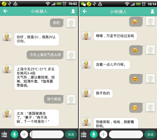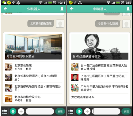 9月6日,易信安卓1.1版上線,新版本開放了易信公眾平臺。而在同一天,國內(nèi)最大的智能機器人提供商小i機器人宣布,“小i機器人”智能互動易信公眾號同步上線,支持互動聊天,新聞資訊、餐飲、天氣查詢等功能,同時,其智能人機交互系統(tǒng)已為易信渠道做好了整合,即該系統(tǒng)已經(jīng)可以為客戶提供與之前Web、微博、微信渠道上一樣的智能客服、智能營銷服務。