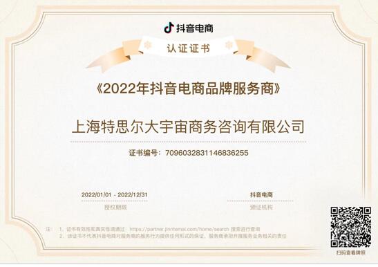 “2022年抖音電商品牌服務(wù)商”認(rèn)證證書