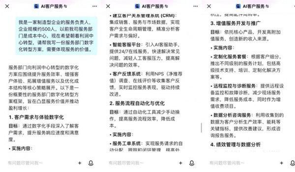AI 客戶服務(wù),是“經(jīng)驗(yàn)非常豐富的售后服務(wù)解決方案專(zhuān)家”,其模型在售后服務(wù)領(lǐng)域處理過(guò)超過(guò) 50,000 個(gè)售后案例,構(gòu)建了一個(gè)包含各種解決方案的龐大知識(shí)庫(kù)。它擁有各個(gè)行業(yè)的管理方法論,能幫助企業(yè)解決發(fā)展中的各式各樣的問(wèn)題,除此之外還能幫助企業(yè)尋找創(chuàng)新的發(fā)展方向,用戶可以向它咨詢行業(yè)、售后服務(wù)工具及數(shù)字化轉(zhuǎn)型等問(wèn)題。