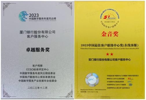 近日,2023中國數(shù)字服務(wù)年度風云榜暨中國客戶聯(lián)絡(luò)中心獎評選、2023金音獎-中國最佳客戶聯(lián)絡(luò)中心與卓越客戶體驗評選揭曉,廈門銀行客服中心的運營管理的精細度和專業(yè)能力獲得呼叫中心業(yè)內(nèi)專家一致好評,榮獲“2023中國數(shù)字服務(wù)年度風云榜暨中國客戶聯(lián)絡(luò)中心獎-卓越服務(wù)獎”及“2023金音獎-中國最佳客戶聯(lián)絡(luò)中心(在線客服)獎”兩項榮譽,廈門銀行網(wǎng)絡(luò)金融部總經(jīng)理助理兼客服中心經(jīng)理馬惠娟獲得“2023年度服務(wù)領(lǐng)袖獎”及“2023年中國最佳客戶聯(lián)絡(luò)中心優(yōu)秀管理人獎”榮譽。