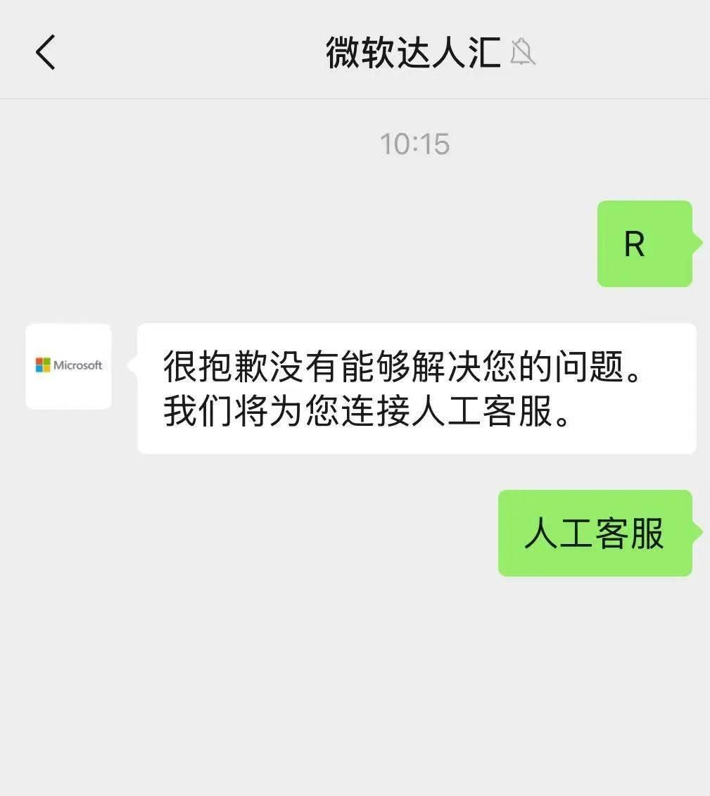 而微軟官方提供的、唯一可以與技術(shù)人員實時溝通的公眾號“微軟達人匯”中,該用戶表示,“只有第一次提問有人回應(yīng)”,其提交的問題,在十天之后仍未收到任何回復(fù),形同石沉大海。《IT時報》記者也嘗試在該公眾號聯(lián)系人工客服,截至發(fā)稿未獲回應(yīng)。