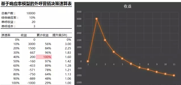 精準(zhǔn)營銷:盲目的電話外呼營銷在大多數(shù)接到電話的人的心目中已經(jīng)不再是一個(gè)正面的舉動(dòng),面對(duì)客戶日益增強(qiáng)的抵觸心理和普遍不信任的社會(huì)環(huán)境,成功率普遍低下是不得不面對(duì)的一個(gè)問題。即使通過短期非正常手段獲得了不錯(cuò)的轉(zhuǎn)化率,但客戶生命周期能否持久,流失曲線是否平緩,總體生命周期價(jià)值貢獻(xiàn)高低等問題值得去深思。在這種情況下,經(jīng)過客戶細(xì)分后的精準(zhǔn)營銷策略,則會(huì)顯著提高產(chǎn)品推薦的針對(duì)性和相關(guān)性,并最終提升轉(zhuǎn)化率、銷售額和利潤率。而同時(shí)坐席的收入和成就感也會(huì)從中受益。例如,下圖中就展現(xiàn)了經(jīng)過客戶精準(zhǔn)細(xì)分之后的收益變化情況。從圖中可以看出,并不是呼出的越多你的收益就越高,而是在經(jīng)過對(duì)客戶的判斷與挑選后,用相對(duì)最少的呼出量而獲取最大化收益才是我們追求的目標(biāo)。