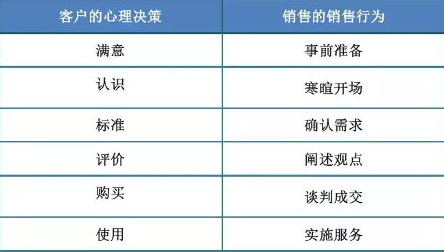 左列表明的是在銷售過程中客戶的心理決策循環(huán),右列表明了每個(gè)客戶心理決策階段,銷售人員應(yīng)該作出的銷售行為。