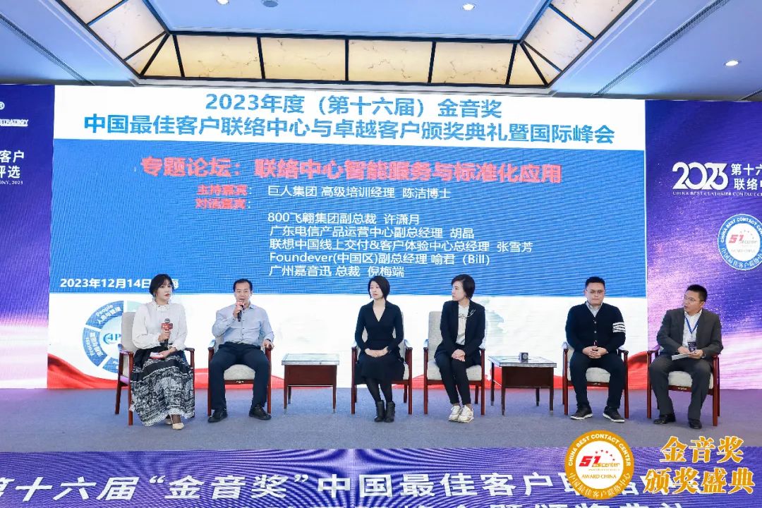 年會(huì)期間舉行了專題為“聯(lián)絡(luò)中心智能服務(wù)與標(biāo)準(zhǔn)化應(yīng)用 ”的圓桌論壇,華安財(cái)產(chǎn)保險(xiǎn)客服總經(jīng)理 魏安達(dá)、800飛翱集團(tuán)副總裁許瀟月、廣東電信產(chǎn)品運(yùn)營(yíng)中心副總經(jīng)理胡晶、巨人集團(tuán) 高級(jí)培訓(xùn)經(jīng)理陳潔博士、Foundever(中國(guó)區(qū))副總經(jīng)理喻君、聯(lián)想中國(guó)線上交付&客戶體驗(yàn)中心總經(jīng)理 張雪芳、廣州嘉音迅總裁倪梅端等參與了討論;