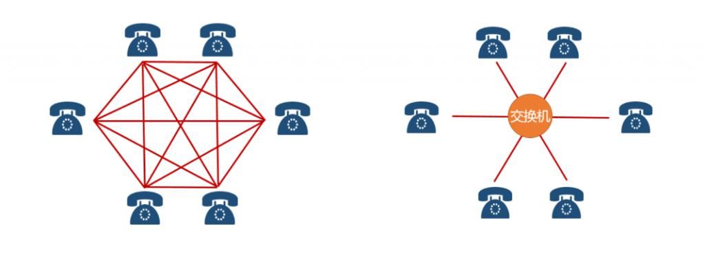 1875 年貝爾在實(shí)驗(yàn)室內(nèi)發(fā)明了電話,但是最初的電話呼叫必須在訂戶之間直接連接:電話和電話線是成對出售的。如果有 100 個用戶需要實(shí)現(xiàn)電話互通,那就至少需要 100*99=9900 條電話線路。