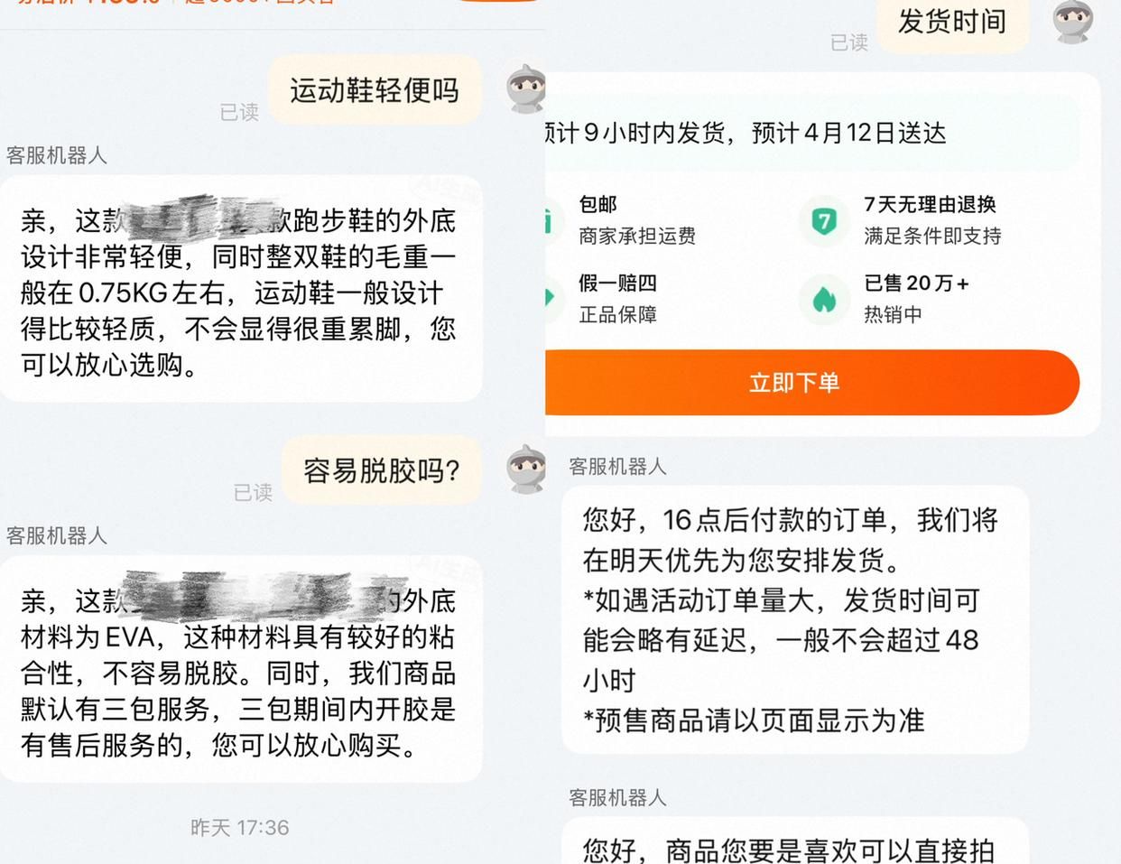 9日,潮新聞在某運(yùn)動(dòng)品牌線上旗艦店,將一款運(yùn)動(dòng)鞋鏈接發(fā)給客服,并詢問(wèn)“運(yùn)動(dòng)鞋輕便嗎”“容易脫膠嗎”“發(fā)貨時(shí)間”等問(wèn)題,對(duì)方均以AI客服作答,且回答內(nèi)容較為精準(zhǔn)。