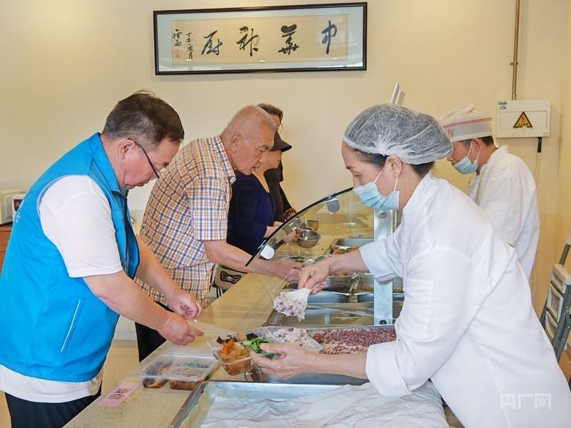 老人在區(qū)域養(yǎng)老中心的社區(qū)餐廳打飯(央廣網(wǎng)記者 龐婷 攝)