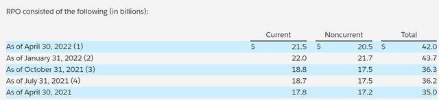 截至第一季度末,Salesforce剩余履約價值約為420億美元,同比增長20%。目前剩余的履約價值在第一季度末約為215億美元,同比增長21%,按固定匯率計算增長24%。