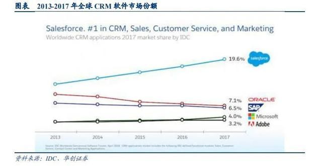 從 CRM 領(lǐng)域來看,Salesforce 的市場占有率接近 20%,并且不斷提升,呈現(xiàn)強者恒強的趨勢。IDC 數(shù)據(jù)顯示,自2013 年以來,Salesforce 連續(xù)五年蟬聯(lián)全球 CRM 市場第一,并且市場份額持續(xù)提升,2017 年 Salesforce 的市場占有率達(dá)到 19.6%,超過位居第二、三、四名的 Oracle、SAP 和微軟的市場份額之和。與此同時,老牌的 CRM 廠商 Oracle和 SAP 的市場份額卻處于持續(xù)下滑中。有分析認(rèn)為,在 SaaS 快速發(fā)展的浪潮下,Salesforce 的市場份額有望繼續(xù)提升。