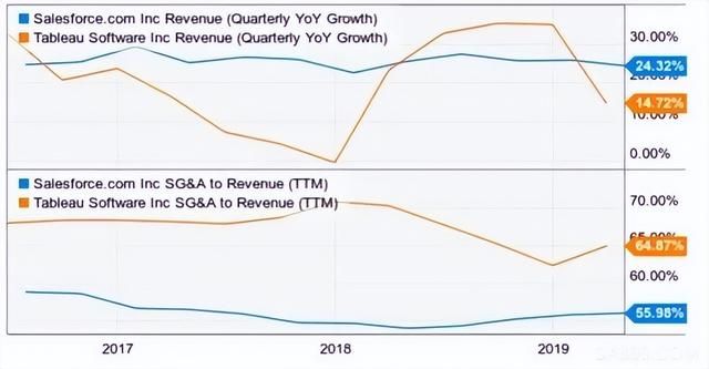 對Salesforce來說,不僅需要付出高價收購的代價,同時整合Tableau后,還會在短期給其財務(wù)業(yè)績帶來一定的拖累。