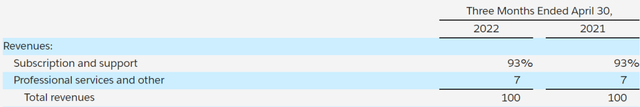 將業(yè)務(wù)收入按產(chǎn)品劃分,訂閱和支持的收入占比93%,專業(yè)服務(wù)和其他占比7%。