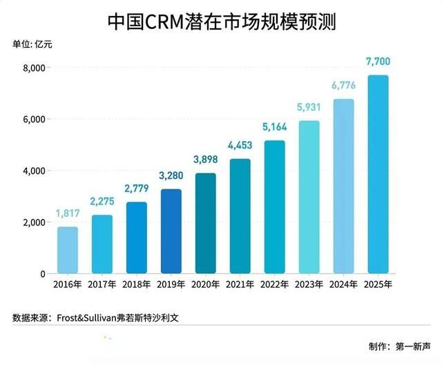 過去近十年里,不管是全球還是中國,CRM市場仍然在持續(xù)增長。 據(jù)沙利文數(shù)據(jù)顯示,國內(nèi)基于CRM的企業(yè)服務市場的潛在規(guī)模預計將由2016年的1817億元增加至2020年的3898億元,復合年增長率為21%。 于2025年,潛在市場規(guī)模有望達到7700億元,復合年增長率為14.6%。