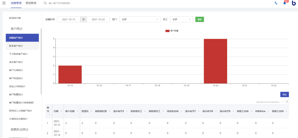 企客寶SCRM系統(tǒng)部署了統(tǒng)計分析這一功能,企業(yè)可以通過客戶統(tǒng)計、銷售機會統(tǒng)計、合同統(tǒng)計、款項統(tǒng)計、票據(jù)統(tǒng)計等直觀了解到相關的數(shù)據(jù)統(tǒng)計,頁面上部分為直方圖,下部分是以時間記錄的歷史數(shù)據(jù),如此一來方便企業(yè)管理層全面并具體的掌控各項數(shù)據(jù),助力管理層做出正確決策。