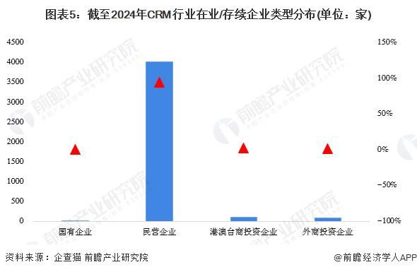 從在業(yè) / 存續(xù)企業(yè)類型分布來看,CRM 廠商主要以民營企業(yè)為主,截至 2024 年 2 月,CRM 行業(yè)在業(yè) / 存續(xù)企業(yè)中民營企業(yè)的數(shù)量達 4022 家,占比近 95%,總體來看,民營企業(yè)是我國 CRM 行業(yè)發(fā)展中最為重要的組成部分。