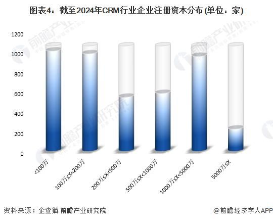 從企業(yè)注冊資本的分布情況來看,存續(xù)和在業(yè)的企業(yè)中,注冊資本小于 100 萬元的 CRM 廠商較多,截至 2024 年 2 月達 1003 家 ; 其次是 100-200 萬元的廠商,達 975 家,這主要與 CRM 行業(yè)有相當一部分廠商僅具備面向中小型企業(yè)開展業(yè)務的能力,經(jīng)營規(guī)模較小有關(guān)。