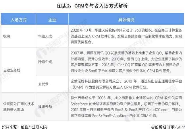 通過對中國 CRM 代表性企業(yè)的發(fā)展歷程和業(yè)務開展進程的總結(jié),可以知道中國 CRM 行業(yè)廠商的入場方式主要包括收購、自建業(yè)務線和依托海外廠商的技術(shù)基礎(chǔ)進入市場,具體內(nèi)容匯總?cè)缦拢?