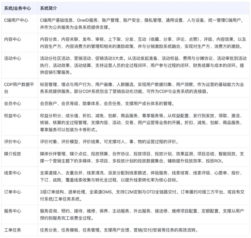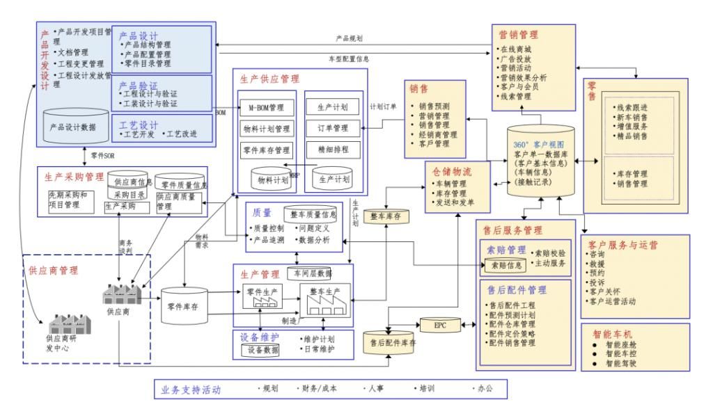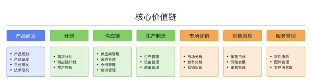 制造業(yè)務(wù)的核心價值鏈中有 3 大核心業(yè)務(wù):產(chǎn)品研發(fā)、生產(chǎn)供應(yīng)鏈、營銷服,構(gòu)成了企業(yè)的核心業(yè)務(wù)鏈路,對應(yīng)的會有 PLM、ERP+MES+SCM、CRM 等核心系統(tǒng),以及圍繞核心系統(tǒng)建設(shè)的小系統(tǒng),或強化核心系統(tǒng)的某個領(lǐng)域,比如 TMS 物流系統(tǒng)、DMS 經(jīng)銷商管理系統(tǒng)、CC 客服系統(tǒng)、CDP 客戶數(shù)據(jù)平臺、EPC 電子圖冊等等。