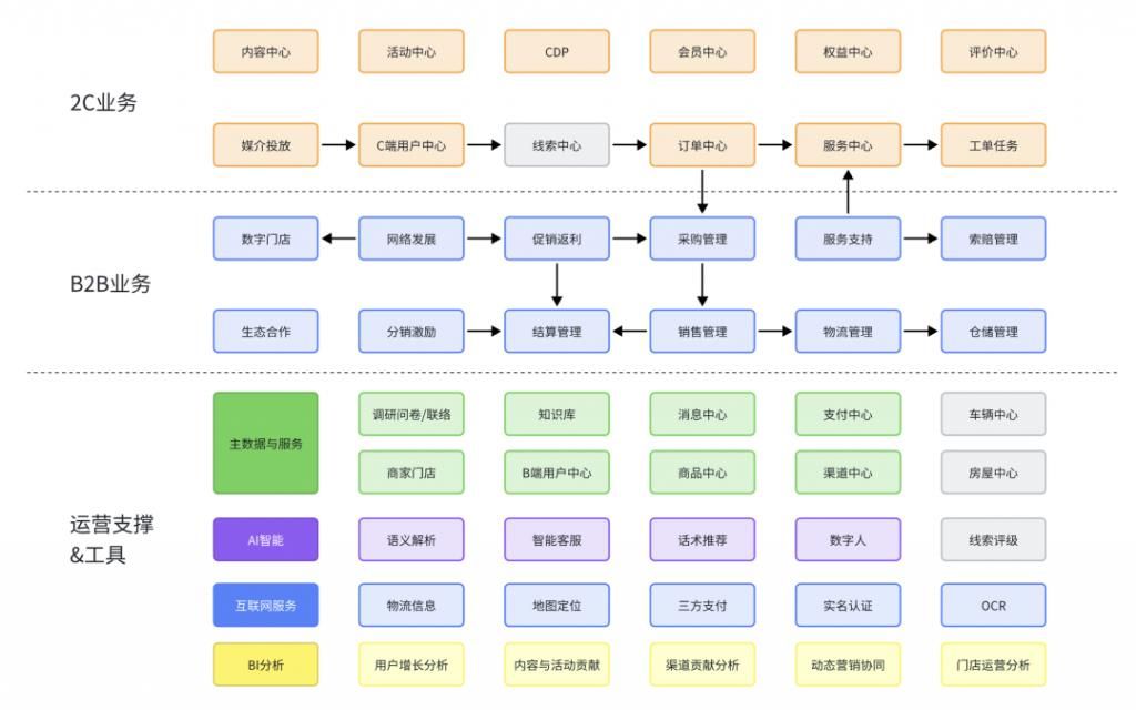 我們把營銷服部分拆解出來,按照 2C、B2B 業(yè)務(wù),即分 C 端業(yè)務(wù)、B 端業(yè)務(wù),將核心的系統(tǒng)呈現(xiàn)出來。大部分的營銷服部分是通用的,線索中心、車輛中心等是汽車行業(yè)特有功能。有了營銷服平臺支撐的 DTC,可保障品牌用優(yōu)質(zhì)的體驗、有競爭力的價格服務(wù)用戶,并促進一線業(yè)務(wù)單元的高效運轉(zhuǎn)。