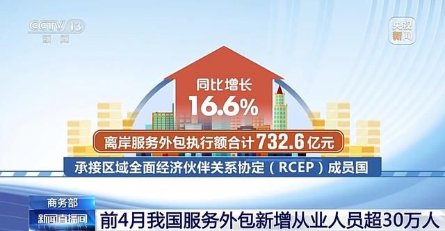 從吸納就業(yè)看,截至2024年4月底,我國服務外包累計吸納從業(yè)人員1617.2萬人,其中大學及以上學歷1056.4萬人,占65.3%。1-4月,服務外包新增從業(yè)人員30.1萬人,其中大學及以上學歷25.5萬人,占84.7%。