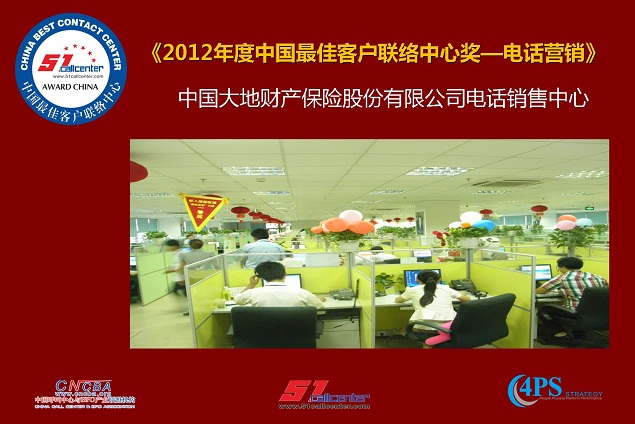 據(jù)悉,大地財(cái)產(chǎn)保險(xiǎn)股份有限公司電話銷售中心在近期舉行的”2012年度客戶聯(lián)絡(luò)中心與CRM評(píng)選頒獎(jiǎng)典禮”中榮獲《2012中國(guó)最佳電話營(yíng)銷獎(jiǎng)》,此獎(jiǎng)項(xiàng)的企業(yè)。該活動(dòng)由呼叫中心與BPO行業(yè)資訊網(wǎng)(51Callcenter)主辦,工信部軟件與集成電路促進(jìn)中心、中國(guó)呼叫中心與BPO產(chǎn)業(yè)聯(lián)盟(CNCBA)指導(dǎo),4PS聯(lián)絡(luò)中心國(guó)際標(biāo)準(zhǔn)作為指導(dǎo)標(biāo)準(zhǔn)。中國(guó)中央電視臺(tái)對(duì)此活動(dòng)與評(píng)選做了新聞報(bào)道。
